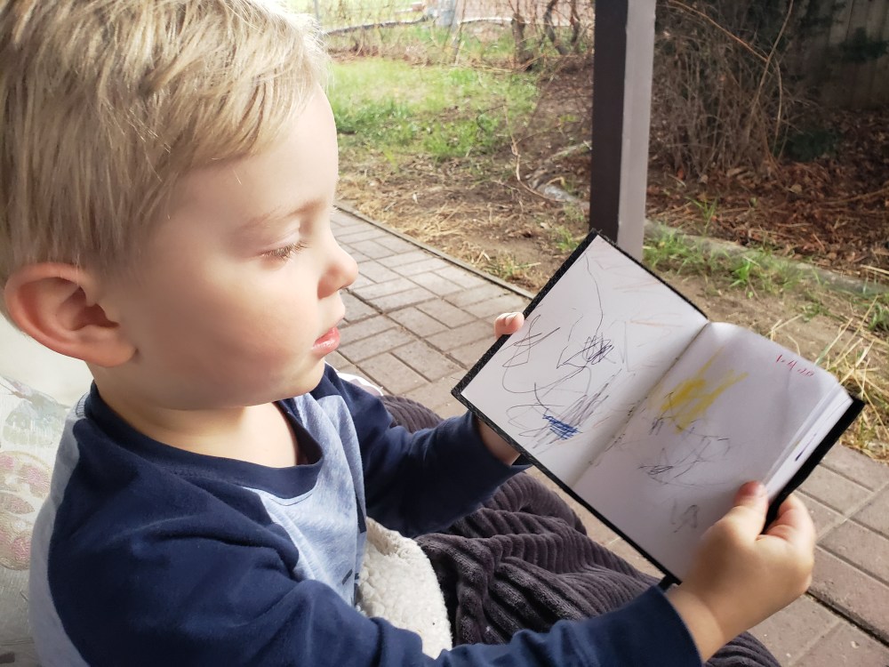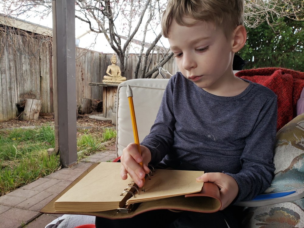 Rain pouring down, the sounds of thunder, flashes of lightening and tires on the nearby freeway. I’m out with the boys on the patio sofa… A lovely moment as we three write in our own leatherbound journals. These boys are absolutely amazing!! Filling Corona virus days at home with such joy and creative magic. “Joy, joy joy” Ronen says while Teague draws with a quiet focus.